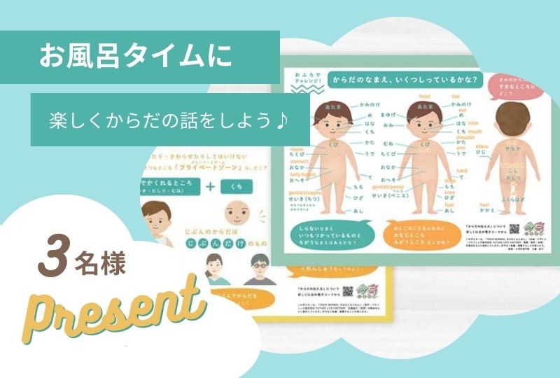 内容:【英語表記付き改訂版】お風呂ポスター「からだ」「プライベートゾーン」2枚セット期間:2024年6月19日~2024年7月15日 人数:抽選3名様