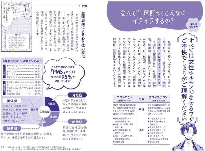 そんな疑問には、女性の心と体は、エストロゲン(卵胞ホルモン)とプロゲステロン(黄体ホルモン)という女性ホルモンの影響を強く受けていることを、月経周期のメカニズムとともに解説。